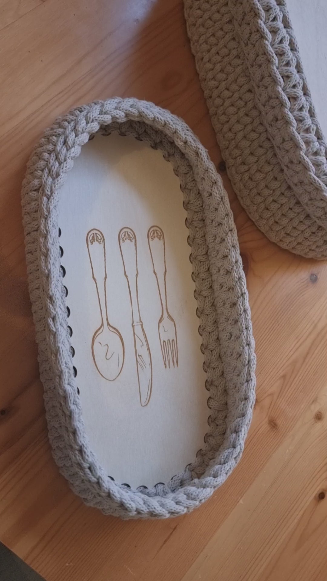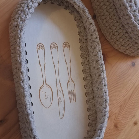 A stylish handmade basket with a wooden base decorated with an elegant engraving of cutlery. Surrounded by thick, braided cotton cord, it works wonderfully as a table organizer or kitchen accessory. Ideal for storing cutlery, napkins, spices, or small items. Its natural, cozy design brings a warm, artisanal feel to any interior.